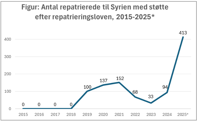 Indtil videre har 523 personer gjort brug af repatrieringsordningen i 2025. 413 af disse er repatrieret til Syrien. Det er markant højere end de 94 personer, der er registreret som repatrieret til Syrien i hele 2024.